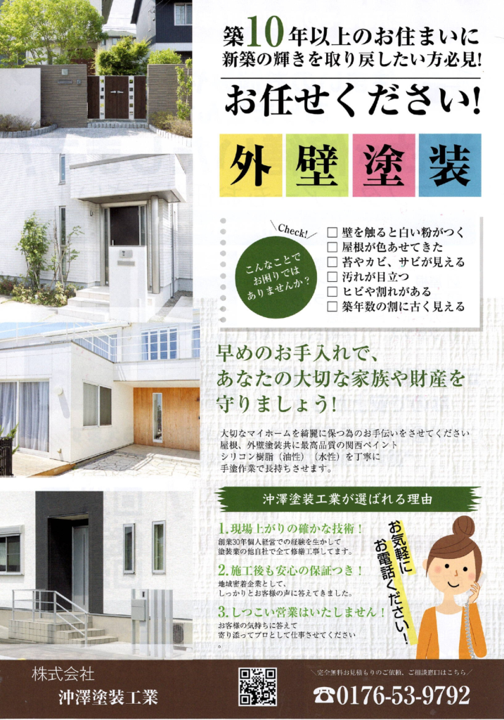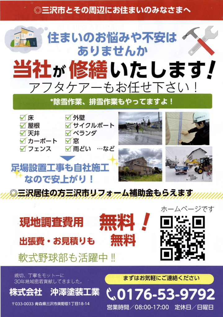 外壁・屋根の塗り替えから内装工事、除雪作業まで 青森県三沢市で30年以上の実績を持つ沖澤塗装工業が、確かな技術でお応えします。